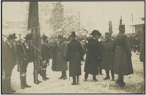 Erzherzog Karl Franz Joseph, der als Karl I. der letzte österreichische Kaiser sein sollte, wurde 1887 als Sohn von Erzherzog Otto und Prinzessin Maria Josepha von Sachsen geboren. 1911 ehelichte er Zita von Bourbon-Parma aus dem nicht (mehr) regierenden Haus der Herzöge von Parma. Als Erzherzog Franz Ferdinand am 28. Juni 1914 in Sarajewo einem Attentat zum Opfer fiel, rückte Karl als dessen Neffe in der Thronfolge nach (Franz Ferdinands Kinder waren aufgrund von dessen morganatischer Ehe mit Sophie Gräfin Chotek davon ausgeschlossen) und wurde nach dem Hinscheiden Franz Josephs I. (21. November 1916) als Karl I. zum österreichischen Kaiser und apostolischen König von Ungarn. Anfang Dezember 1916 übernahm er den Oberbefehl über die Armee, griff auch persönlich in die Kriegsführung ein und reiste häufig an die Front. So auch im Jänner 1917, als er auf dem Weg an die Südwestfront kurze Zeit in Bozen Halt machte. Karl erreichte die tief verschneite Stadt, wo das Heeresgruppenkommando von Feldmarschall Erzherzog Eugen seinen Sitz hatte, am 15. Jänner. Am Bozner Bahnhof wurde er von Eugen, von General Josef Roth und Feldmarschallleutnant Ludwig Goiginger sowie einer großen Menschenmenge empfangen. Darunter befand sich laut zeitgenössischen Zeitungsberichten auch ein Grödner Hochzeitszug, „der in den überaus malerischen und zugleich sehr wertvollen Trachten die besondere Aufmerksamkeit und das sichtliche Wohlgefallen des Kaisers auf sich zog“ (im Bild spricht der Kaiser vermutlich mit Mitgliedern einer Schützenkompanie vom Schlernplateau).