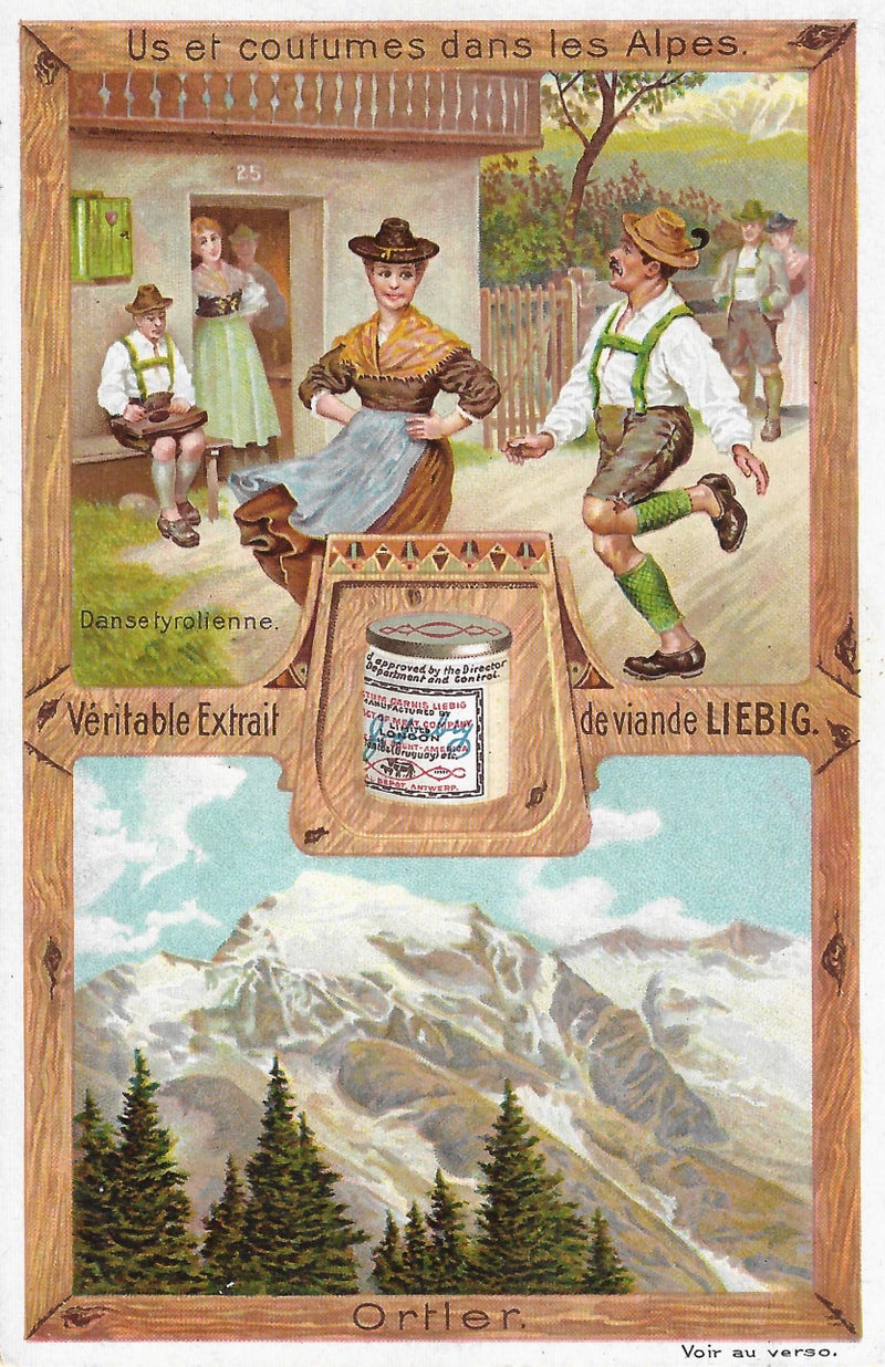 Eine Serie war den Sitten und Gebräuchen der Alpen gewidmet, jeweils begleitet von der Abbildung eines markanten Bergs. Sogar eine mit Wasserkraft betriebene Mühle in Feldthurns schaffte es auf eine Liebig-Sammelkarte, während auf der Rückseite die maschinelle Abfüllung des Fleisch-Extrakts in einer Fabrikanlage zu sehen war.