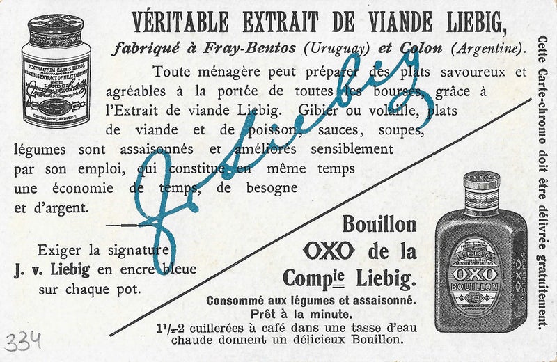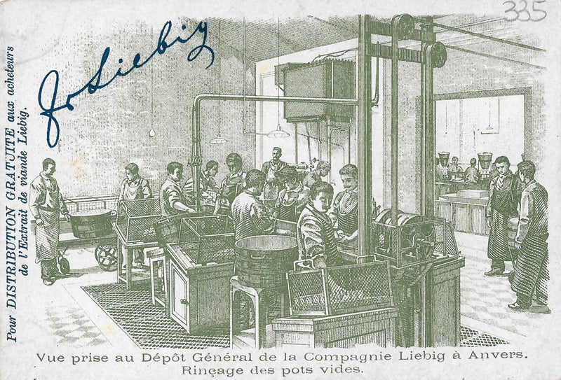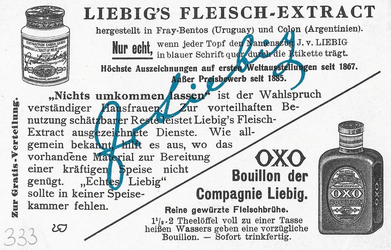 Ebenso genial wie das Produkt selbst war die Verkaufsstrategie: Jeder Packung Fleischextrakt war ab 1875 ein sogenanntes Liebig-Bild beigefügt, später auch ganze Serien. Die vielen Tausend Liebig-Bilder, die lehrhaften Charakter hatten und in verschiedenen Sprachen erschienen, wurden schnell zu begehrten Sammelobjekten: Während auf der Rückseite das Produkt beworben wurde, zierten die Vorderseite Abbildungen von Landschaften, Pflanzen, Tieren und Völkern ferner Länder oder auch Szenen aus der Geschichte, aus Märchen oder Opern.