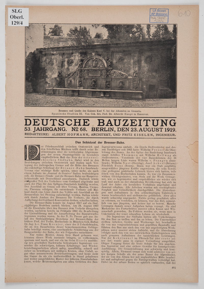 „Der Friedensschluß zwischen Oesterreich und den feindlichen Mächten trifft durch seine Bestimmungen über die territorialen Abgrenzungen der neuen Staatengebilde in besonders empfindlichem Maß das Netz der österreichischen Südbahn. Dabei wird in den Beziehungen zwischen Oesterreich und Italien nach Verlegung der italienischen Grenze auf die Höhe des Brenners das zukünftige Schicksal der Brenner-Bahn Innsbruck–Verona eine wichtige Rolle spielen, umso mehr, als nach einem Aufsatz im ‚Journal de Genève‘ Italien beabsichtigen soll, die Brenner-Straße und die Brenner-Bahn zur Hauptverkehrsstraße mit Deutschland auszubauen.“