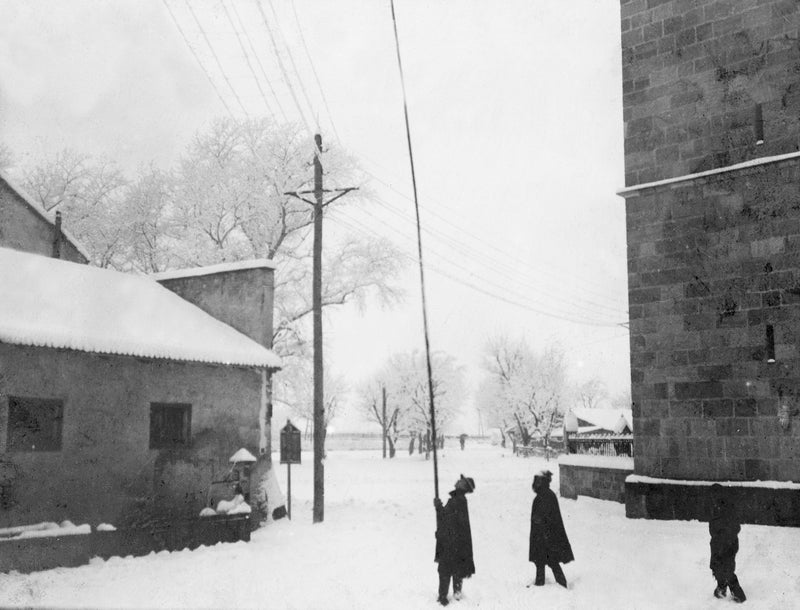 Aus der Frühzeit der Stromversorgung: Drei Männer im Schnee