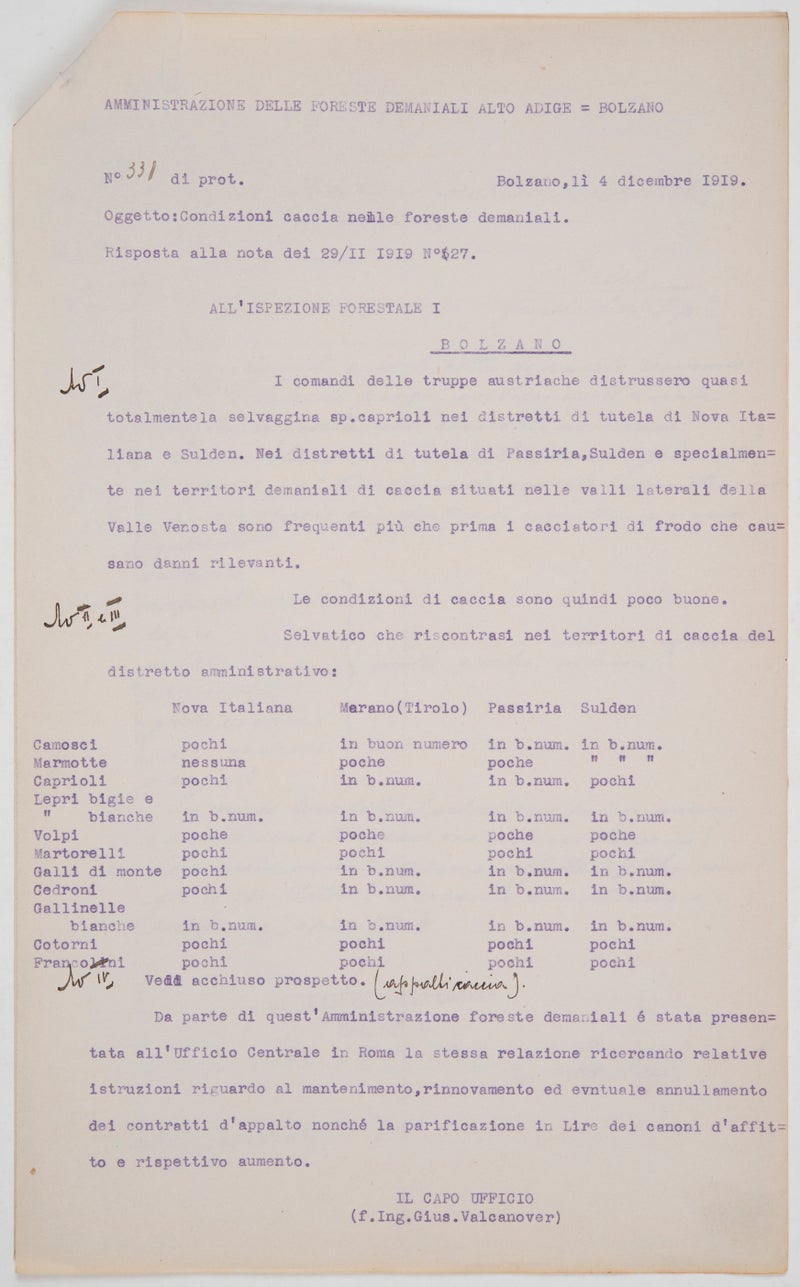 Mit dem Übergang Südtirols an Italien gingen auch die Domänenforste, also die hier liegenden ehedem österreichischen Staatswälder, in das Eigentum des Königreichs über. Gegen Ende des Jahres 1919 sandte Ingenieur Valcanover, der Leiter der Domänenforstverwaltung, an das Forstinspektorat in Bozen einen Bericht über die Wildbestände bzw. Jagdbedingungen in den vier staatlichen Forstbezirken Welschnofen, Dorf Tirol, Passeier und Sulden. Namentlich im Einzugsgebiet von Sulden und Welschnofen seien die Wildbestände durch Angehörige der österreichisch-ungarischen Streitkräfte arg dezimiert worden und es gebe mehr denn je Wilderer, vor allem in den Revieren in Passeier, Sulden und in den Seitentälern des Vinschgaus. Dem Bericht schloss er eine summarische Aufstellung der Wildbestände in den vier Forstbezirken an: Lediglich Schneehasen und Schneehühner gab es hier demzufolge noch in ausreichender Anzahl, während die Populationen von Füchsen, Mardern, Stein- und Haselhühnern durchwegs gering waren. Die übrigen aufgeführten Tierarten, wie Gämsen, Murmeltiere, Rehe, Feldhasen, Birk- und Auerhühner waren in einigen Gebieten in guter Zahl anzutreffen, in anderen dagegen stark dezimiert. Die Wildbestände in Südtirol schwankten im Laufe der Jahrhunderte stark: Auf Phasen starker Bejagung folgten wiederum Zeiten relativer Schonung, in denen sich die Bestände erholen konnten, dann aber wegen zunehmender Wildschäden wieder stärker bejagt wurden. Im 19. Jahrhundert erreichten die Wildbestände einen historischen Tiefststand und auch der Erste Weltkrieg trug nicht eben zur Besserung der Lage bei, da nicht nur die k. u. k. Truppen, sondern auch die hungernde Bevölkerung durch Wildtiere ihren kargen Speiseplan aufzubessern versuchte. Am Ende des Kriegs gab es in Südtirol praktisch kein Rotwild mehr, erst ab 1920 wanderte es vom Westen her wieder ein. Optionszeit und Zweiter Weltkrieg brachten für das Wild wiederum schwere Zeiten, am Ende des Kriegs gab es z. B. kaum noch Rehe. Durch eine längere Schonphase und strenge Jagdregeln konnten sich die meisten Wildbestände in der zweiten Hälfte des 20. Jahrhunderts gut erholen, einige Tierarten, wie etwa die Wachtel oder das Steinhuhn, sind mittlerweile aber sehr selten geworden. Aktuell liegen die Bedrohungen vor allem in den Veränderungen der Lebensräume, bedingt etwa durch den Strukturwandel in der Landwirtschaft, durch die Ausdehnung und Verdichtung der Siedlungsräume und die zunehmende Umweltverschmutzung.