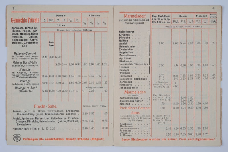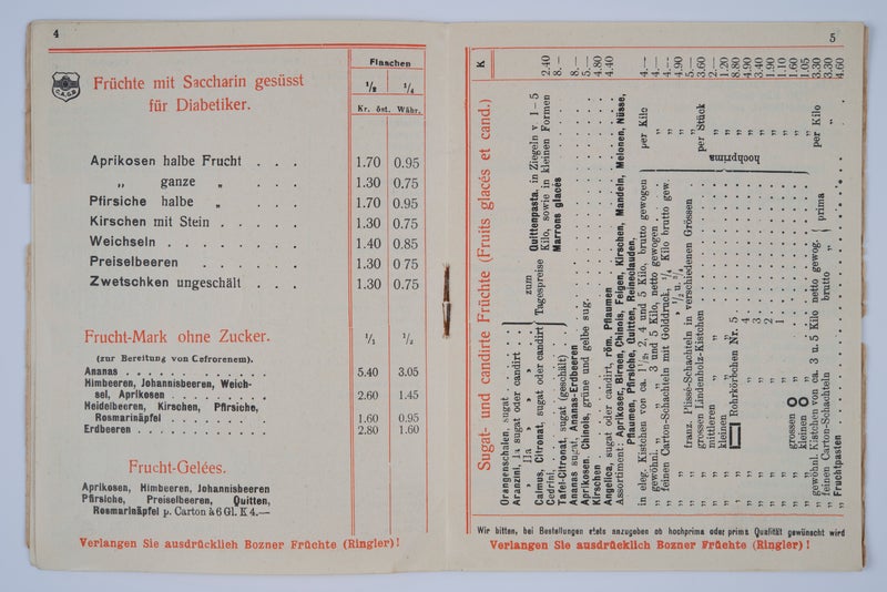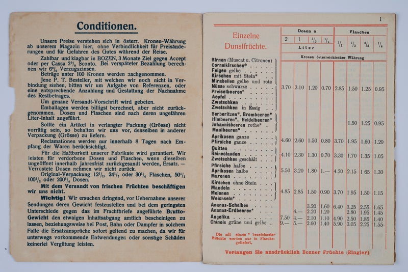 Marillen, Birnen, Feigen, Kirschen oder Zwetschken in Zucker eingekocht, in Rum, Cognac oder in Gewürzessig eingelegt, Fruchtsäfte und Frucht-Gelees, Marmeladen, Kompotte, kandierte Früchte, Früchtebrot, eingekochtes Gemüse, sauer eingelegtes Gemüse, eingelegte Pilze, Senf und sogar fertig zubereitete Fleischspeisen – in Gläsern oder Dosen: Das Produktsortiment der Bozner Conserven-Actien-Gesellschaft war beeindruckend und weit gefächert. Dieser über lange Jahre sehr erfolgreiche Betrieb, der aus einem Kolonialwarengeschäft unter den Bozner Lauben hervorging, wurde 1856 unter dem Namen „Josef Ringlers Söhne“ als eine der ersten Konservenfabriken des Habsburgerreichs gegründet. In einer Zeit, in der es noch keine Kühlschränke gab und in der Frischobst und Gemüse ausschließlich zur Erntezeit erhältlich und die Möglichkeiten zu einer längeren Lagerung beschränkt waren, war die Nachfrage an konservierten Lebensmitteln groß. Doch auch die hervorragende Qualität und der mäßige Preis der Produkte, für die die Firma zahlreiche Preise erhielt – z. B. auf der Weltausstellung in London 1862, bei einer Ausstellung in Hamburg 1869, bei der Weltausstellung in Wien 1873 oder der Weltausstellung in Paris 1900 –, waren ein Grund für den Erfolg und die rasche Expansion des Unternehmens. Nach dem Tod des Firmengründers Carl Ringler im November 1874 wurde das Unternehmen im Folgejahr in eine Akten-Gesellschaft umgewandelt. 1885 entstand in der heutigen Rittnerstraße eine ausgedehnte Fabrikanlage, errichtet vom Neumarkter Ingenieur und Bauunternehmer Albert Canal, die eine industrielle Verarbeitung großer Mengen an Lebensmitteln ermöglichte. Die Firma unterhielt Niederlassungen in vielen Städten, die wichtigsten Märkte waren die Habsburgermonarchie und Deutschland, doch gingen die Bozner Konserven bis nach England, Russland und in die USA. In der wirtschaftlich schwierigen Zwischenkriegszeit hatte auch die Bozner Konservenfabrik mit zunehmenden Absatzschwierigkeiten zu kämpfen, sodass das Fabrikgebäude aufgegeben und das Unternehmen ab 1934 in stark verkleinerter Form – nun wieder unter dem Namen „Ringler“ – fortgeführt wurde, das Geschäftslokal unter den Bozner Lauben wurde 1989 aufgelassen