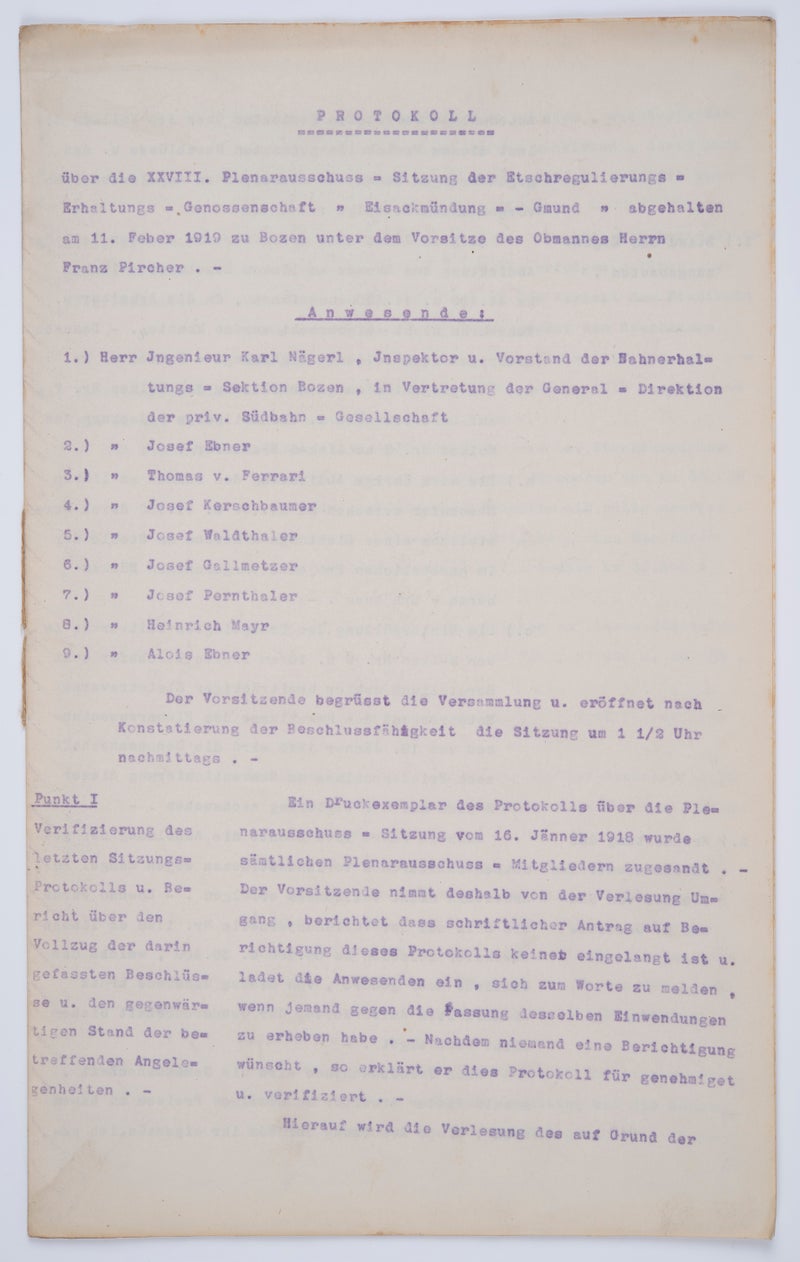 Nachdem die Etsch über Jahrhunderte in regelmäßigen Abständen über die Ufer getreten war, bisweilen ganze Landstriche unter Wasser gesetzt hatte, und die vereinzelt ausgeführten Wehrbauten und Regulierungsarbeiten nur mäßigen Erfolg gezeitigt hatten, beschloss die Regierung in Wien in der zweiten Hälfte des 19. Jahrhunderts, den Fluss ab Meran vollständig zu verbauen. Ab 1879 ließen der Staat, das Kronland und die neugegründeten Etschregulierungs-Genossenschaften „Passer–Eisackmündung“ und „Gmund–San Michele“ (später „Gmund–Salurn“) zunächst den Abschnitt zwischen Meran und Bozen, dann die Strecke zwischen Auer und San Michele begradigen und mit Dämmen versehen. Das Jahrhunderthochwasser von 1882 machte einen Teil dieser Bemühungen wieder zunichte; in der Folge wurde beschlossen, auch den Abschnitt zwischen der Eisackmündung und Gmund zu regulieren. Bis 1894 waren die letzten Arbeiten abgeschlossen und die drei Genossenschaften wurden zu Etschregulierungs-Erhaltungs-Genossenschaften umgewandelt. In den jährlichen Sitzungen der Leitungsgremien der Genossenschaften wurden die notwendigen Arbeiten besprochen und deren Finanzierung und Durchführung geregelt. Welche Schwierigkeiten der Erste Weltkrieg und der Übergang von Südtirol an Italien für die Erhaltung der Regulierungsbauten und den Hochwasserschutz mit sich brachte, kann man dem Protokoll der am 11. Februar 1919 in Bozen abgehaltenen Plenarausschuss-Sitzung der Etschregulierungs-Erhaltungs-Genossenschaft Eisackmündung–Gmund entnehmen. Wichtige Arbeiten wie etwa die Abdichtung und Aufhöhung des Etschdammes, das Ausholzen der Vorlandstrecken oder die Entfernung des Geschiebes aus dem Flussbett hatten 1918 gar nicht oder nur teilweise durchgeführt werden können, da alle wehrfähigen Männer im Felde standen und kaum Arbeiter aufzutreiben gewesen waren. Ein entsprechendes Ansuchen der Genossenschaft an die k. u. k. Heeresleitung um Arbeiter und Fuhrwerke vom Jänner 1918 war abgelehnt worden. Von einem finanziellen Beitrag der k. u. k. Militärbauabteilung, den die Genossenschaft Ende Oktober 1918 quittiert hatte, wird berichtet: „Mittlerweile ist der Postverkehr übern Brenner infolge der Besetzung Südtirols mit italienischen Truppen abgesperrt worden und es ist nicht bekannt ob die Zahlung erfolgt ist oder nicht.“ Eine Entschädigung für das 1917 erfolgte Abweiden eines Etschdammes durch Militärpferde war von der Heeresverwaltung ebenso nicht gezahlt worden wie für das der Genossenschaft gehörige, vom k. u. k. Militär-Verpflegs-Magazin Ende Oktober 1918 abtransportierte Holz aus der Fritzi-Au bei Pfatten. Das restliche Holz war während des Rückzugs der österreichisch-ungarischen Truppen Anfang November 1918 – wieder zum Schaden der Genossenschaft – von Einheimischen geplündert worden, die es für Militäreigentum gehalten hatten. Auch in den Folgejahren mahnte die Genossenschaft die ausstehenden Beträge erfolglos ein. In den 1920er Jahren veränderten sich die rechtlichen Rahmenbedingungen für die Etschregulierungs-Genossenschaften: 1926 wurden die Zuständigkeiten für den Wasserbau dem Staatsbauamt (Genio Civile) übertragen, die Etschregulierungs-Erhaltungs-Genossenschaften widmeten sich fortan der Meliorierung der durch die Regulierung neu gewonnenen Anbauflächen. Zwischen 1927 und 1931 wurden die drei Genossenschaften in Bonifizierungskonsortien umgewandelt, sie prägten (und prägen) durch ausgedehnte Bodenverbesserungen und großflächige Anpflanzung von Obstbäumen das Gesicht des Etschtales bis heute.