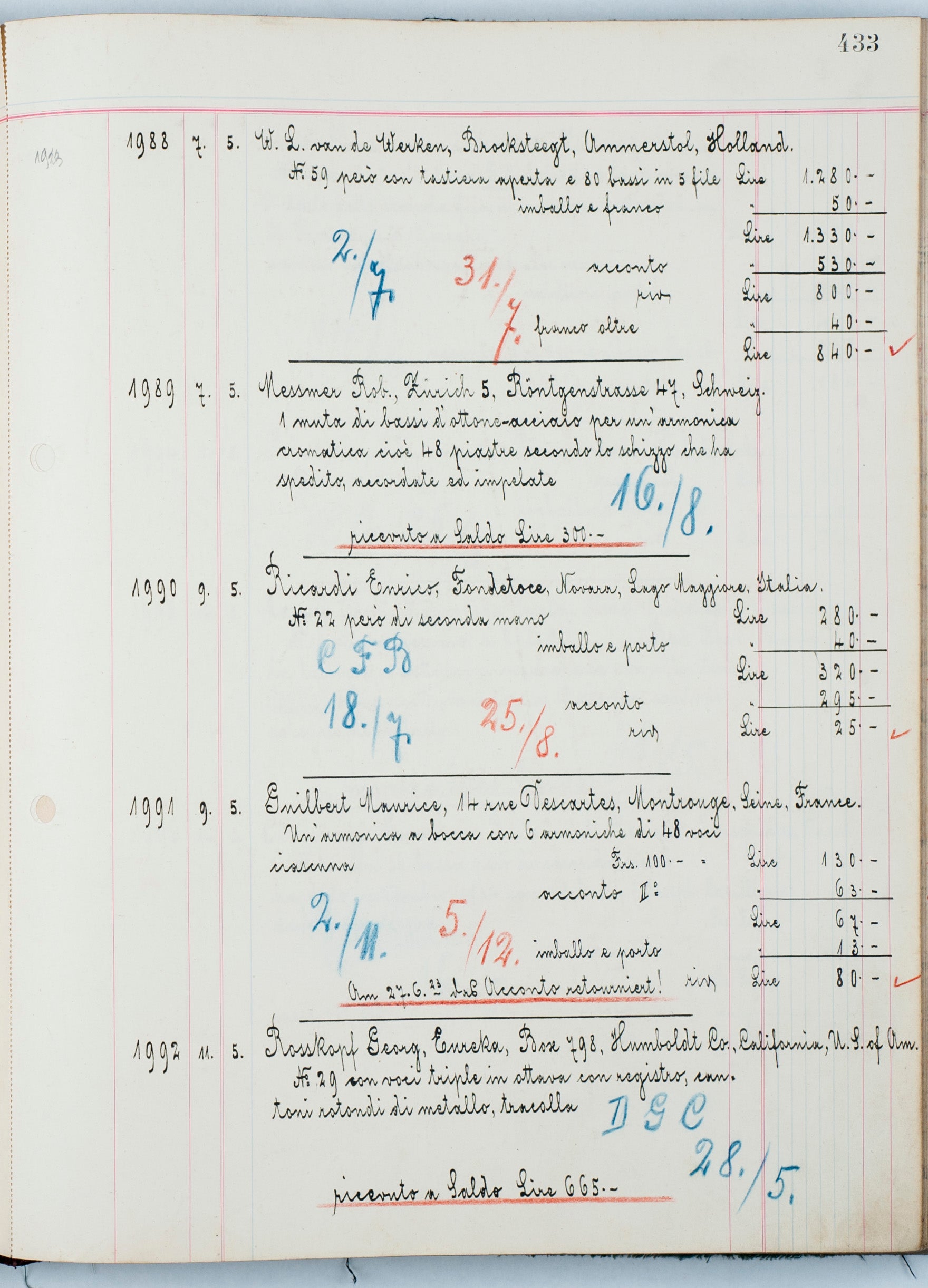 1871 gründete der aus Sarnonico im Nonsberg stammende Fedele (Fidel) Socin in Bozen eine Harmonika- und Harmoniummanufaktur, die wegen ihrer hohen Fertigungsstandards schon bald einen guten Ruf genoss. Die nach ihrem Firmengründer benannte Fabrik stellte nicht nur Instrumente her, sondern übernahm auch Reparaturen. Da sich die Werkstatt in der Fleischgasse, der heutigen Museumsstraße, im Laufe der Jahre als für das expandierende Unternehmen zu klein erwies, ließ der Firmeneigner in der Kaiserin-Elisabeth-Straße (heute Sparkassenstraße) 1899 eine neue Produktionsstätte errichten. Ab 1902 stieg Fidel Socins Sohn Rüdiger (Ruggero) als Partner in die Firma ein und führte das Unternehmen nach dem Tod des Vaters 1917 durch die wirtschaftlich schwierigen Jahrzehnte der ersten Nachkriegszeit. Harmonikas der Marke Fidel Socin waren nicht nur in Europa sehr geschätzt, sondern wurden bis nach Russland, Australien, Nordafrika und in die Vereinigten Staaten exportiert. Davon zeugt der hier präsentierte Auszug vom Mai 1923 aus einem der Auftragsbücher mit Bestellungen von Kunden aus den Niederlanden, der Schweiz, Italien, Frankreich und Kalifornien.