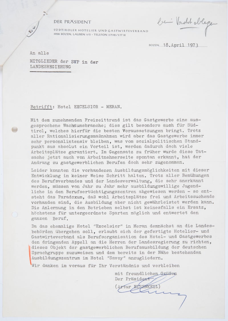Wenn Artur Eisenkeil als Präsident des Südtiroler Hotelier- und Gastwirteverbandes im April 1973 die Mitglieder der SVP in der Landesregierung eindringlich ersuchte, das ehemalige Hotel „Excelsior“ (vormals Kaiserhof) für die gastgewerbliche Berufsausbildung der deutschen Sprachgruppe zuzuweisen und dem bereits in der Nähe bestehenden Ausbildungszentrum im Hotel „Savoy“ anzugliedern, so ist dies dem Umstand geschuldet, dass sich die Tourismusbranche mit 10 Millionen Übernachtungen im Jahr 1970 in einer expansiven Wachstumsphase befand. Der steigende Personalbedarf in diesem Sektor eröffnete Südtiroler Arbeitnehmerinnen und Arbeitnehmern neue Perspektiven, die auch von sozialpolitischer Seite dankbar begrüßt wurden. Die Beherbergungs- und Willkommenskultur – nach Schätzungen des Landes brachten alleine die ausländischen Gäste 1969 rund 62 Milliarden Lire ins Land – sollte sich nicht mehr auf das damals gängige „fließend Deutsch & Warmwasser“ beschränken, sondern neben geschultem Mitarbeiterinnen- und Mitarbeiternachwuchs auch gastgewerblichen Unternehmerinnen- und Unternehmernachwuchs heranbilden. Im Sommer 1974 konnte Landeshauptmann Silvius Magnago schließlich dem Hotelier- und Gastwirteverband vermelden, dass in der Jahresbilanz ein Betrag für die Instandsetzung einer adäquaten Immobilie bereitgestellt wurde.