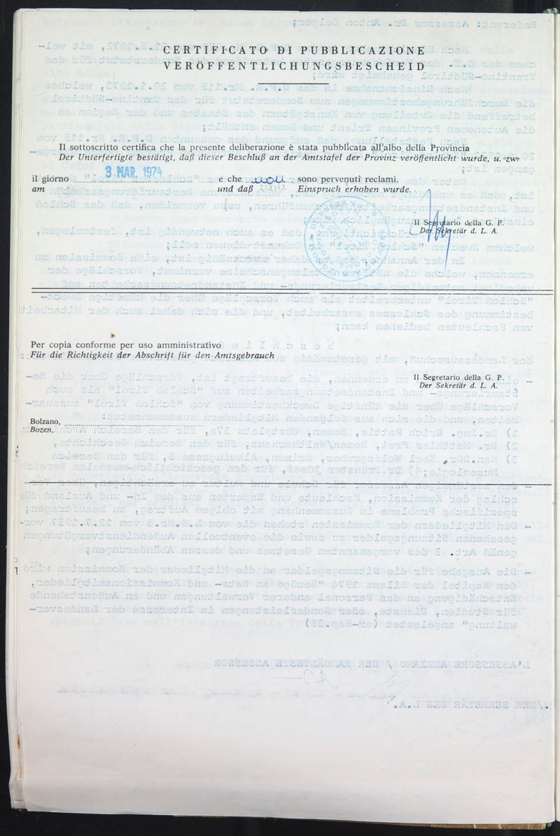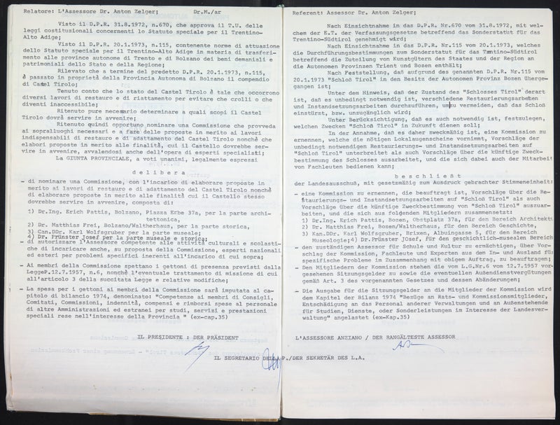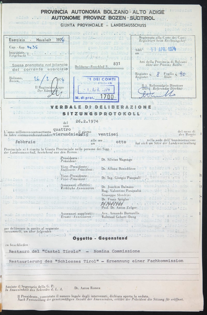 1973 durchschreitet Landeshauptmann Silvius Magnago öffentlichkeitswirksam als frisch gebackener „Schlossherr“ das mit reicher romanischer Bauplastik aus Ratschinger Marmor verzierte Portal der Pankratiuskapelle von Schloss Tirol. Schloss Tirol steht als namengebende Burg der älteren Grafen wie kein zweites Bauwerk für die Geschichte des Landes.