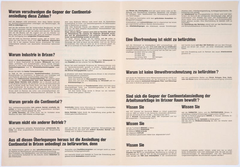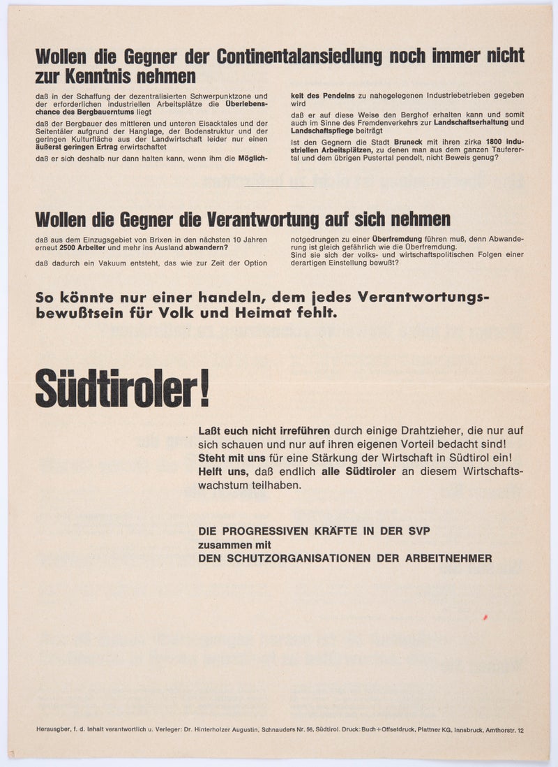 Der Sekundärsektor, der damals in vielen Regionen namentlich Norditaliens ein beträchtliches Wachstumspotential aufwies, hätte hier Abhilfe schaffen können. Doch hatte Südtirol daran nur geringen Anteil, vielmehr war die industrielle Produktion hierzulande Anfang der 1960er Jahren sogar rückläufig: Zum einen rief die Industrie bei der Mehrheit der deutschsprachigen Bevölkerung wegen der politisch geprägten, forcierten faschistischen Industrialisierungspolitik der 30er Jahre negative Assoziationen wach, zum anderen hegten die auf das Bild einer vermeintlich intakten Landschaft bedachten Touristiker Vorbehalte gegen die Ansiedelung neuer Industriebetriebe.
