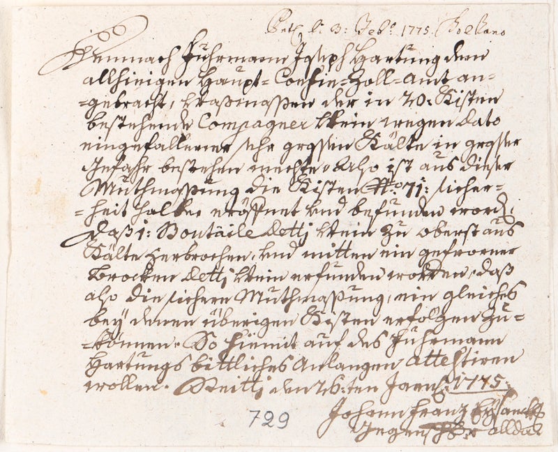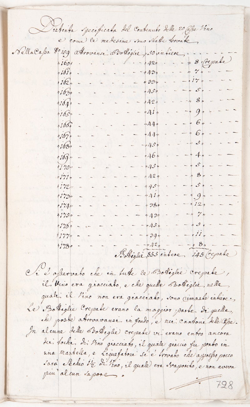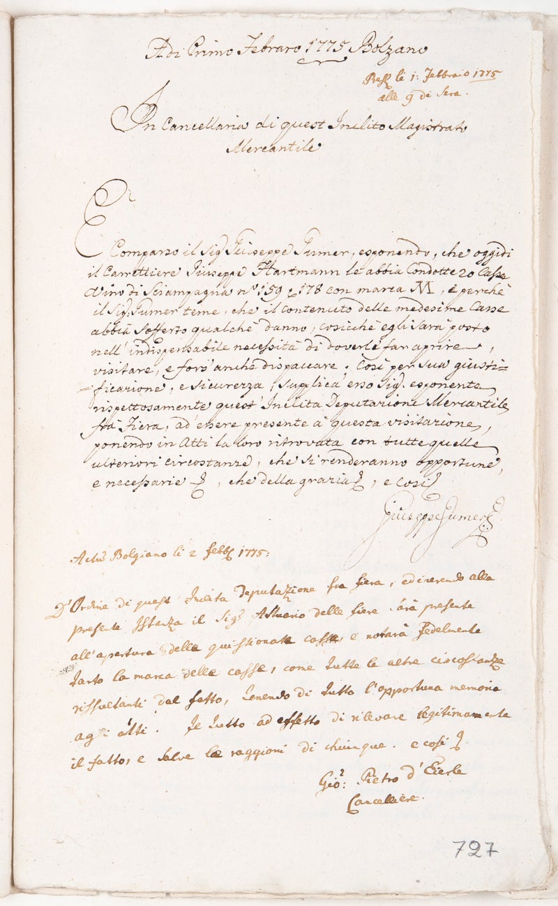 Am 1. Februar 1775 begab sich der Bozner Kaufmann Joseph Gumer, Mitglied einer der wirtschaftlich erfolgreichsten und einflussreichsten Familien der Talferstadt, zum Merkantilmagistrat, um dem Handelsgericht einen Vorfall anzuzeigen, durch den er vermutlich eine größere Summe Geld verloren hatte. Eine Lieferung von eintausend Flaschen französischen Schaumweins waren in den ersten Wochen des Jahres 1775 auf dem Weg nach Bozen, um dort verkauft oder weitertransportiert zu werden. Wegen dato eingefallener sehr grosser Kälte gefror der Champagner aber zu Eis – Schaumwein gefriert bereits ab einer Temperatur von –5° C – und zahlreiche Flaschen barsten. Champagner wurde ab 1728 in Flaschen und nicht mehr in Fässern exportiert und gewann im Laufe des 18. Jahrhunderts zunehmend an Beliebtheit. Nach einem Attest des Grenzbeamten in Reutte wurden am 26. Jänner 1775 in den zwanzig Kisten in der Tat zahlreiche geborstene Flaschen sowie Brocken des gefrorenen Champagners festgestellt. Als der Fuhrmann Bozen erreichte, waren in den zwanzig Kisten insgesamt 145 Flaschen zerbrochen, auch hatte der Schaumwein offenbar an Geschmack eingebüßt. Am Abend des 3. Februar bestätigten der Aktuar des Merkantilmagistrats, Giuseppe Serafino Bruni, und ein Amtsdiener nach einem Lokalaugenschein den Sachverhalt. Ob der Bozner Kaufmann die Flaschen abschreiben musste oder der Fuhrmann beziehungsweise die Kellerei für den Schaden hafteten, wissen wir nicht. Doch wirft dieser Vorfall ein Licht auf Handelsrouten, auf transportierte Waren und auf Transportprobleme. Bozen war seit dem Messeprivileg Erzherzogin Claudias von 1635 eine florierende Handelsstadt geworden und die viermal jährlich stattfindenden Messen dienten als Drehscheibe für den Handel mit allerlei Waren, vor allem mit Wein und Tuchen. Entstand zwischen Kaufleuten ein Streit, wurde dieser vor das paritätisch aus deutschen und italienischen Kaufleuten zusammengesetzte Merkantilgericht gebracht, das zügig und fachkundig entscheiden konnte. Prozessakten zu Betrügereien, beschädigten Waren oder zahlungsunfähigen Firmen bilden einen großen Teil des Archivs des Bozner Merkantilmagistrats, des Vorläufers der 1850 gegründeten Handelskammer, und dienen als wichtige Grundlage zur Erforschung des Handels und der mitteleuropäischen Handelsbeziehungen vom 17. bis zur Mitte des 19. Jahrhunderts.