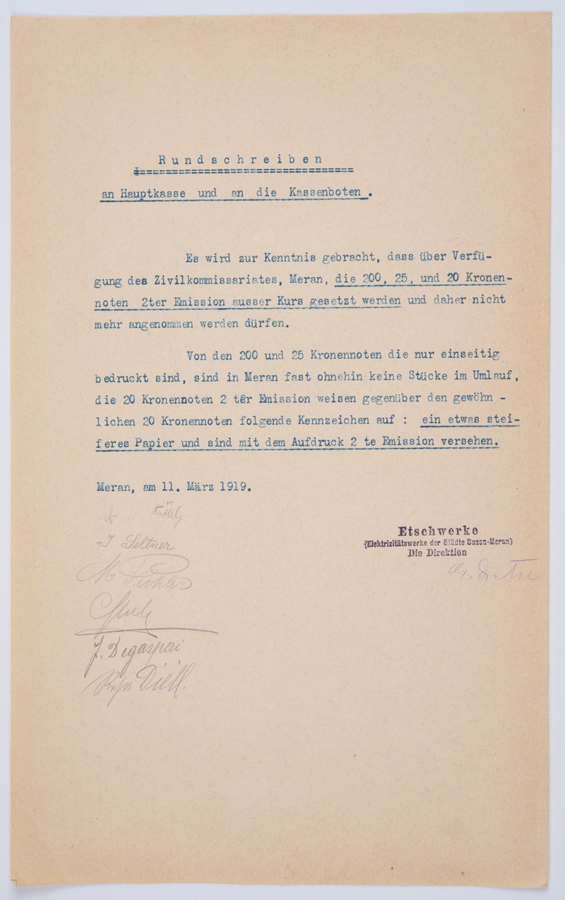 Mit welchen Schwierigkeiten die Bevölkerung und speziell auch Wirtschaftstreibende in Südtirol – und auch den restlichen, nach dem Waffenstillstand vom November 1918 an das Königreich Italien angegliederten österreichisch-ungarischen Gebieten – in den ersten Monaten nach Kriegsende zu kämpfen hatten, lassen einige Rundschreiben aus dem Archiv der Etschwerke erahnen. Mit Zirkulare vom 11. März 1919 informierte die Direktion der Etschwerke in Meran ihre Kassenstellen, dass das Zivilkommissariat von Meran die 200-, 25- und 20-Kronennoten zweiter Emission außer Kraft setzen werde und diese somit nicht mehr anzunehmen seien. Zehn Tage darauf machte sie in einem weiteren Rundschreiben erneut darauf aufmerksam, dass nach einer Verfügung des italienischen Heereskommandos alle abgestempelten Geldnoten der Nachfolgestaaten der Habsburgermonarchie in den besetzten Gebieten (i. e. Trentino, Südtirol usw.) keine Gültigkeit mehr hätten. Zu Kriegsende war die Monarchie in eine Reihe sogenannter Nachfolgestaaten zerfallen, die aber für kurze Zeit noch eine Währungsunion gebildet und die Krone als Zahlungsmittel beibehalten bzw. diese lediglich neu gedruckt oder bestempelt hatten. In Deutschösterreich konnten die kriegsbedingten Verluste nicht durch eine Erhöhung von Steuern ausgeglichen werden, der massive Druck von Papiergeld andererseits führte zu einer enormen Entwertung. Vermutlich fürchtete Italien kurz vor dem geplanten Umtausch von Kronen in Lire eine Flutung des Geldmarktes mit Kronen, denn nach dem Währungswechsel in den besetzten Gebieten wurde Anfang Mai die Einfuhr österreichischer Banknoten wieder erlaubt. Aber auch die zahlreichen gefälschten Geldnoten, die in dieser Übergangszeit in Umlauf waren, haben wohl zu dem Verbot der neu gestempelten Kronen beigetragen. Der endgültige Umtausch von vor dem 27. Oktober 1918 gedruckten Kronen erfolgte zwischen dem 10. und dem 19. April 1919 bei den dazu ermächtigten Banken. Ab dem 20. April war die Krone in Südtirol somit außer Kraft gesetzt. Doch in den fünfeinhalb Monaten zwischen dem Waffenstillstand und der Abschaffung der Krone waren beide Währungen parallel gesetzliches Zahlungsmittel und zwar in dem vom italienischen Heereskommando im November festgelegten Wechselkurs von 1 Krone = 0,40 Lire (erst im November 1919 wurde der Kurs auf 1 Krone = 0,60 Lire festgesetzt). Dies bedeutete nicht nur einen erheblichen Wertverlust der Krone und damit eine massive Entwertung von Sparguthaben, sondern führte auch zu umfangreichen Abschreibungen bei Gläubigern. Hinzu kam eine akute Bargeldknappheit, da die Einfuhr von Papiergeld von jenseits der Waffenstillstandslinie untersagt war. Bereits ab Ende Jänner 1919 sah sich die Direktion der Etschwerke daher gezwungen, ihren Angestellten und Arbeitern die Löhne je zur Hälfte in Kronen und in Lire auszuzahlen, zumal die Einnahmen des Betriebes bereits zu einem großen Teil in Lire erfolgten. Zugleich sicherte die Direktion den Angestellten und Arbeitern zu, einen Ausgleich zu zahlen, sollte die Lira an Kaufkraft verlieren. Die Monate nach dem Kriegsende waren für viele Lohnabhängige eine schwierige Zeit, da viele Gebrauchsgüter und namentlich Lebensmittel sich weiter verteuerten. Die Etschwerke reagierten im Februar 1919 mit der Zahlung einer Kriegsteuerungszulage. Zur Wertminderung kamen außerdem die hohen Verluste durch die mittlerweile wertlosen österreichischen Kriegsanleihen. Diese katastrophale finanzielle Situation traf gerade Lohnabhängige hart, da die Löhne enorm an Kaufkraft verloren. Die Etschwerke versuchten die Wertminderung des Geldes dadurch aufzufangen, dass sie einem Teil ihrer Angestellten das pensionsversicherungspflichtige Einkommen al pari von Kronen in Lire umrechneten. Im Rundschreiben vom 9. August 1919, in dem die Direktion diese Maßnahme den Angestellten mitteilt, wird allerdings wie selbstverständlich darauf hingewiesen, dass diese Maßnahme nicht für weibliche Angestellten gelte, die ihre Bezüge weiter im Verhältnis 1 Krone = 0,40 Lire ausbezahlt bekommen sollten. Zehn Tage später folgte ein neuerliches Rundschreiben, wo den verschiedenen Betriebsstellen und Straßenbahnen zur Kenntnis gebracht wurde, dass ab 30. August 1919 die 20-Heller- und 20-Fillér-Münzen, die im Gegensatz zum Papiergeld noch zirkulierten, endgültig außer Kraft gesetzt würden und somit nicht mehr angenommen werden durften. Mit Ende Oktober verloren auch die 10-, 2- und 1-Hellerstücke ihre Gültigkeit. Damit war die Umstellung auf italienische Lire in Südtirol ein Jahr nach Kriegsende vollzogen.