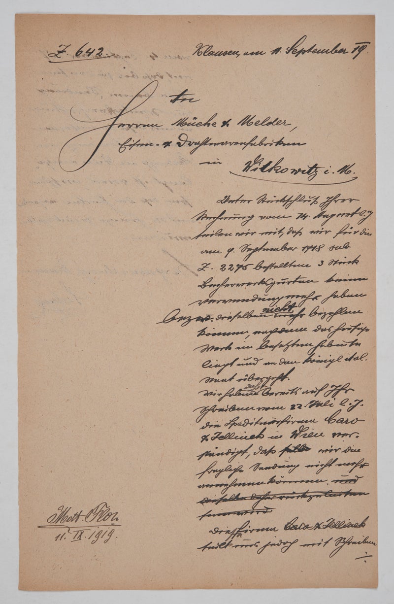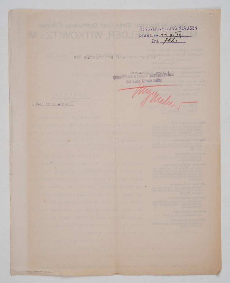 Davon ließ sich die Witkowitzer Eisen- und Drahtwarenfabrik aber nicht beeindrucken, verwies lediglich auf eine schleppende Lieferung infolge einer Verkehrssperre und pochte auf Begleichung der Rechnung bzw. Annahme der Waren, da diese speziell für die Bergverwaltung Klausen angefertigt worden wären und diese sicherlich auch nach einer Übernahme durch den italienischen Staat Verwendung finden würden.