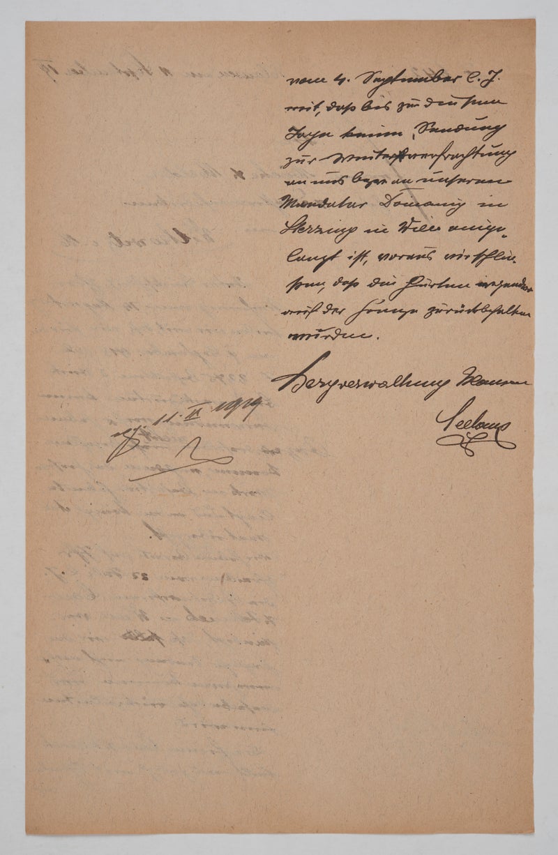 In einem weiteren Brief vom 11. September 1919 teilte sie der nunmehr auf tschechoslowakischem Staatsgebiet liegenden Firma mit, dass sie die Gurte weder brauchen noch bezahlen könne, da die Bergwerke sich in besetztem Gebiet befänden und nunmehr an das Königreich Italien übergehen würden – gerade einen Tag zuvor hatte Österreich den Vertrag von St. Germain unterzeichnet, wodurch Südtirol endgültig zu einem Teil Italiens geworden war.